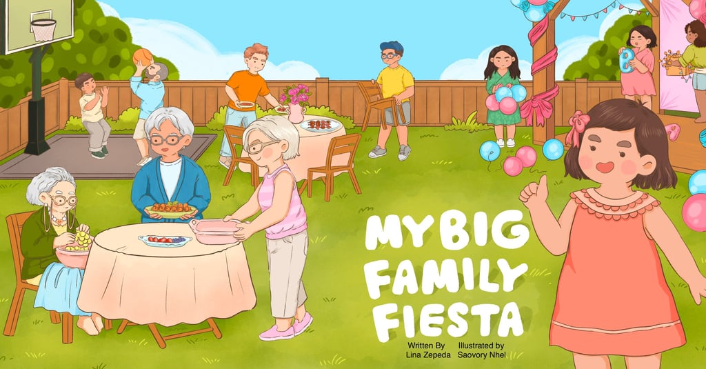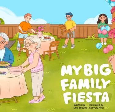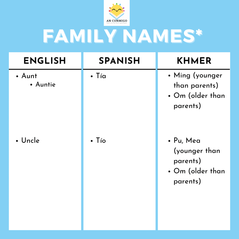 Our newest book “My Big Family Fiesta” celebrates a multicultural family whose members come from different countries and speak 3 languages: English, Spanish and Khmer. Teaching children the names of family members in different languages has numerous benefits. First and foremost, it promotes cultural diversity and understanding. By learning the names of family members in Spanish and Khmer, for example, children gain exposure to different linguistic and cultural traditions.